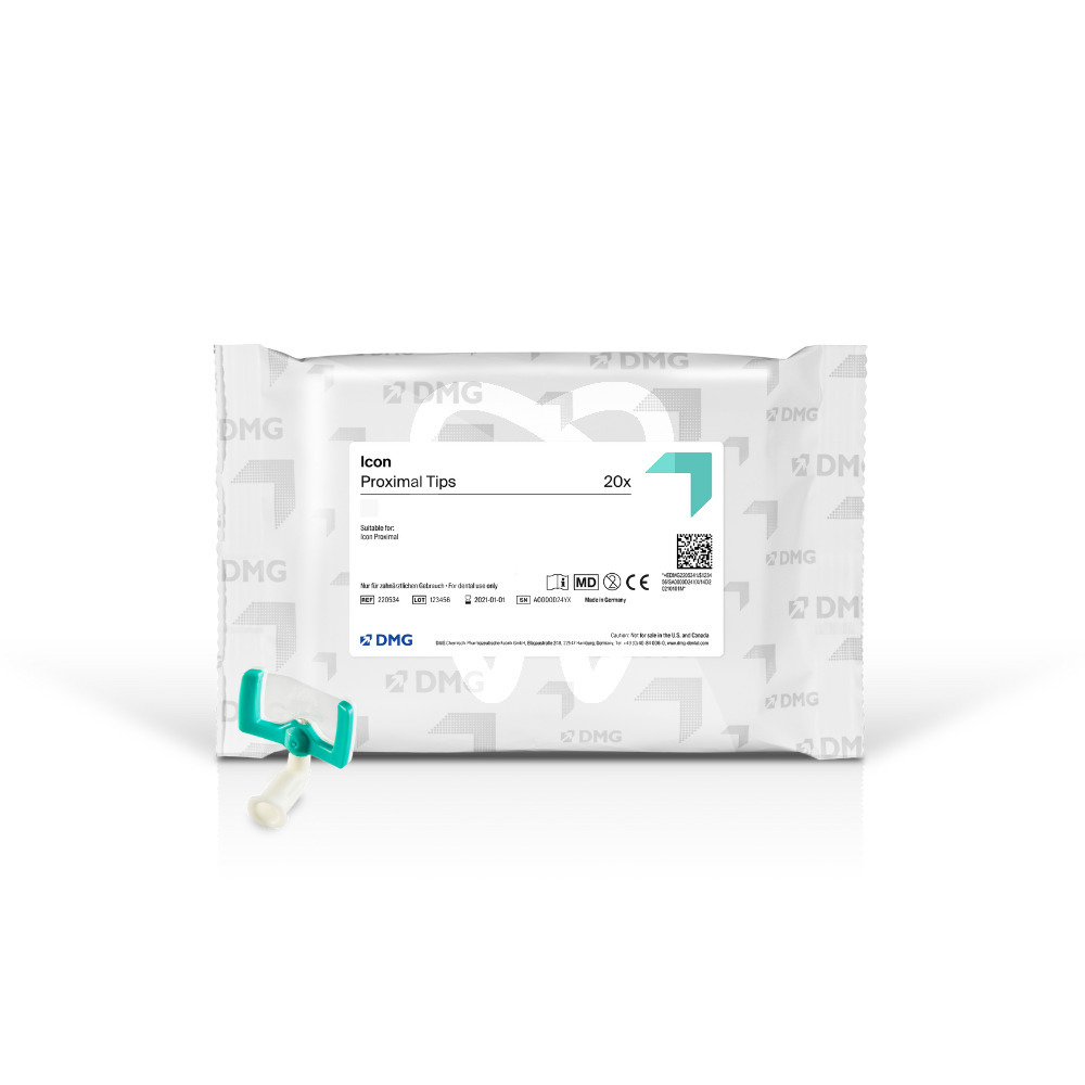 Specjalistyczne końcówki aplikacyjne zaprojektowane do precyzyjnego stosowania systemu Icon w trudno dostępnych przestrzeniach międzyzębowych.