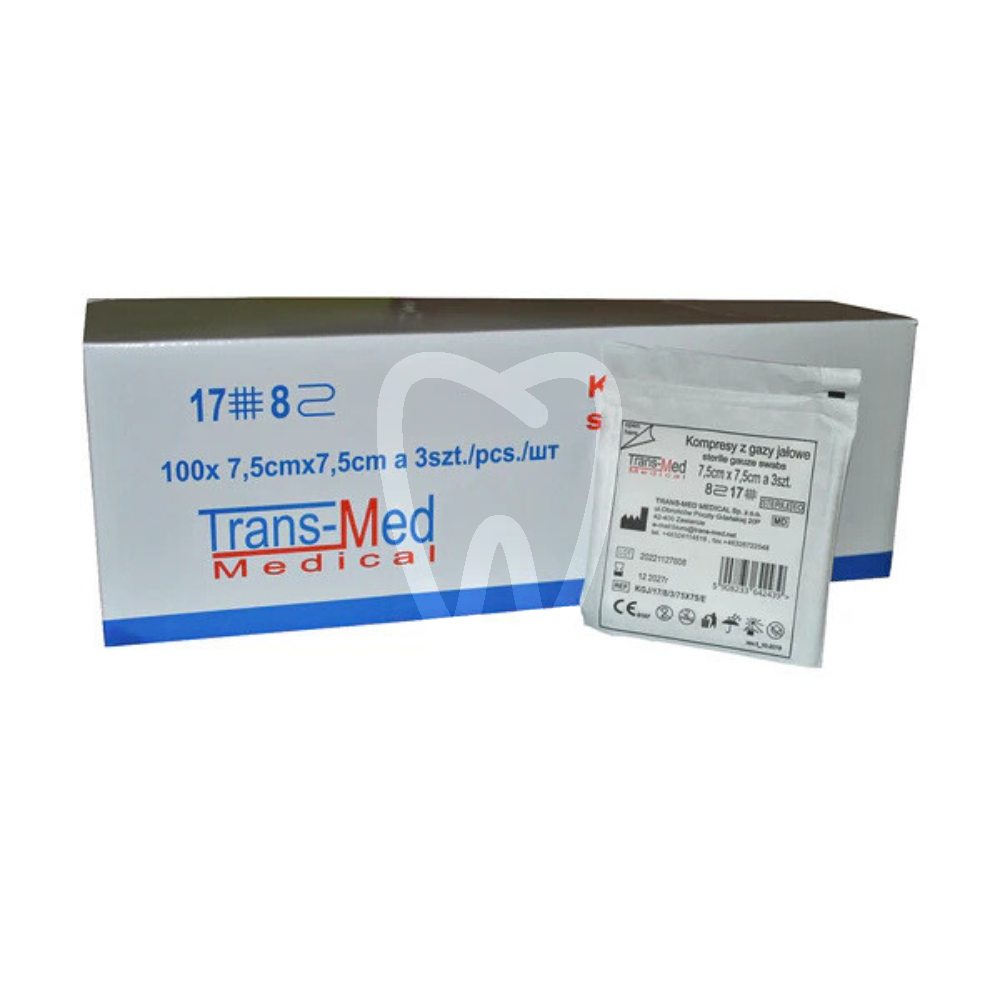 Jałowe kompresy Trans-Med wykonane z gazy bawełnianej, bielonej metodą bezchlorową z użyciem wody utlenionej. Posiadają 17 nitek i 8 warstw, co zapewnia wysoką chłonność i bezpieczeństwo stosowania. Pakowane po 3 sztuki, idealne do zastosowań stomatologicznych. Dostępne w trzech rozmiarach: 5×5 cm, 7,5×7,5 cm i 10×10 cm.