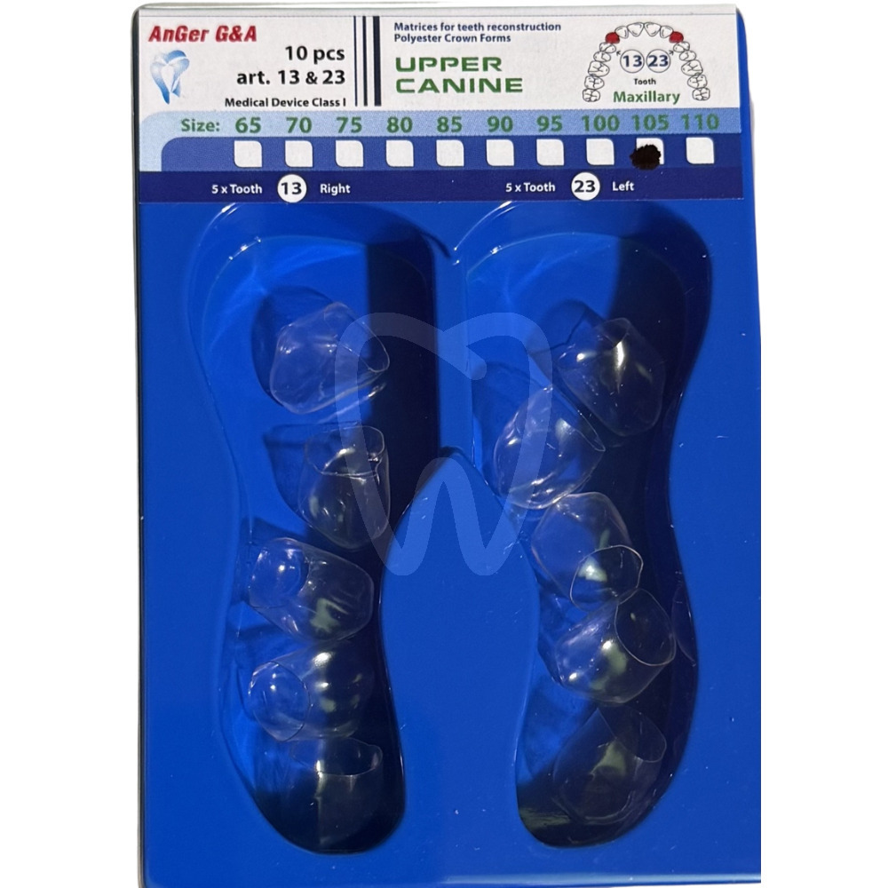 Kształtki poliestrowe marki Anger przeznaczone do odbudowy wykonywanej na kłach.