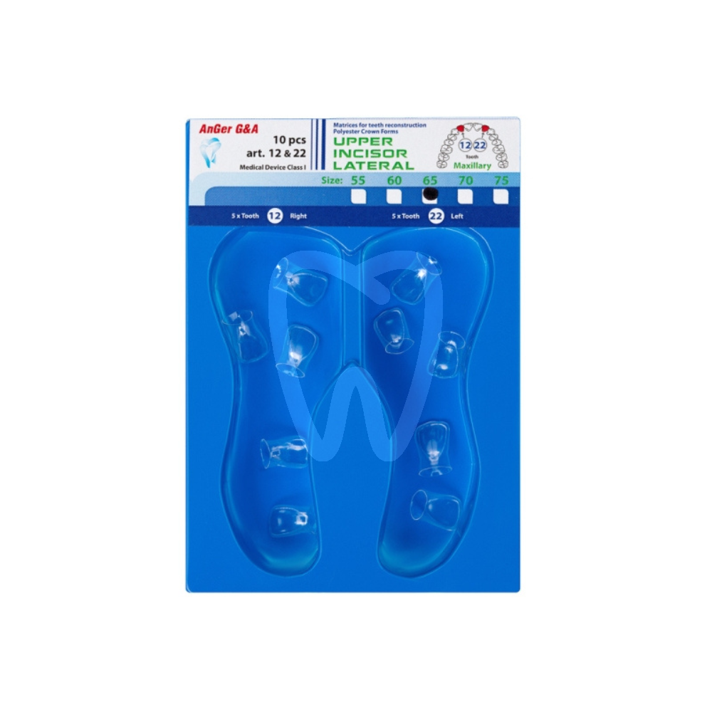 Kształtki poliestrowe AnGer na górne siekacze boczne to zestaw 10 precyzyjnych koron, stworzonych z myślą o łatwym dopasowaniu i naturalnym kształcie zęba.