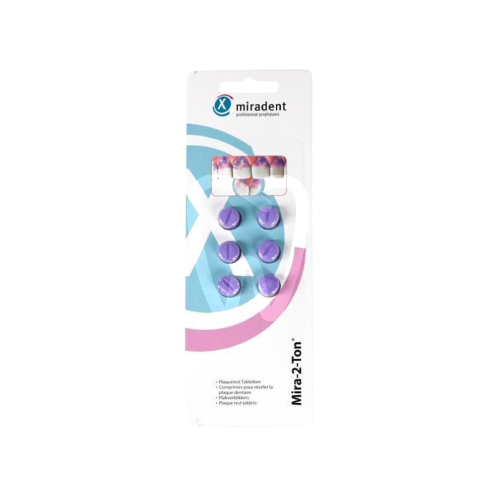 Naturalny preparat diagnostyczny w tabletkach, który dwukolorowo ujawnia świeżą i starszą płytkę nazębną, pomagając w skutecznej kontroli higieny jamy ustnej.
