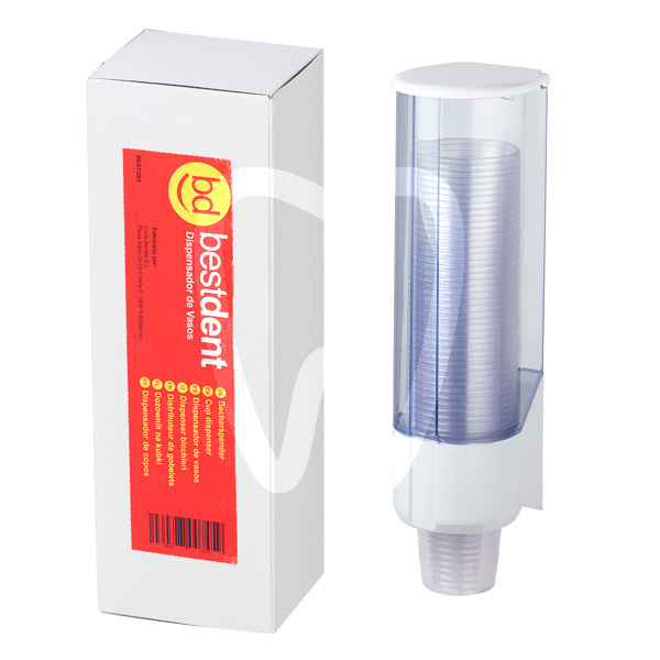 Biały plastikowy dozownik kubków. Pojemność 50 kubków. Wysokość 31 cm.