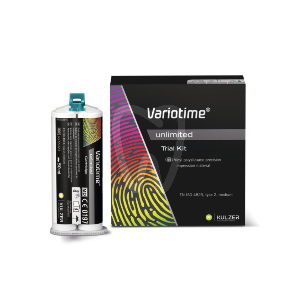 Variotime Unlimited Trial Kit to zestaw próbny wysokiej klasy materiału wyciskowego o właściwościach addycyjnie wiążących (A‑silikon), stanowiącego rozwiązanie odpowiednie do wszystkich technik wyciskowych.