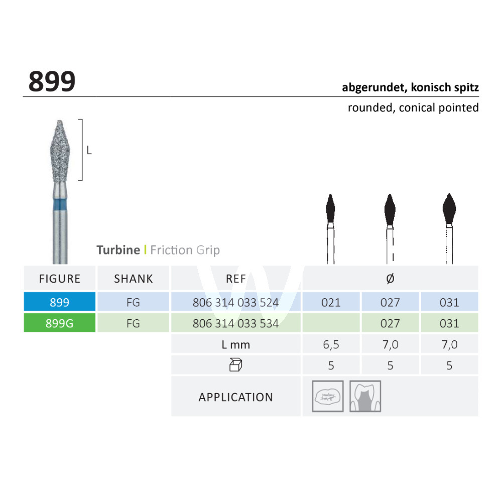 Wiertła diamentowe Jota [899] na turbinę, o zaokrąglonym stożkowo zakończonym kształcie.