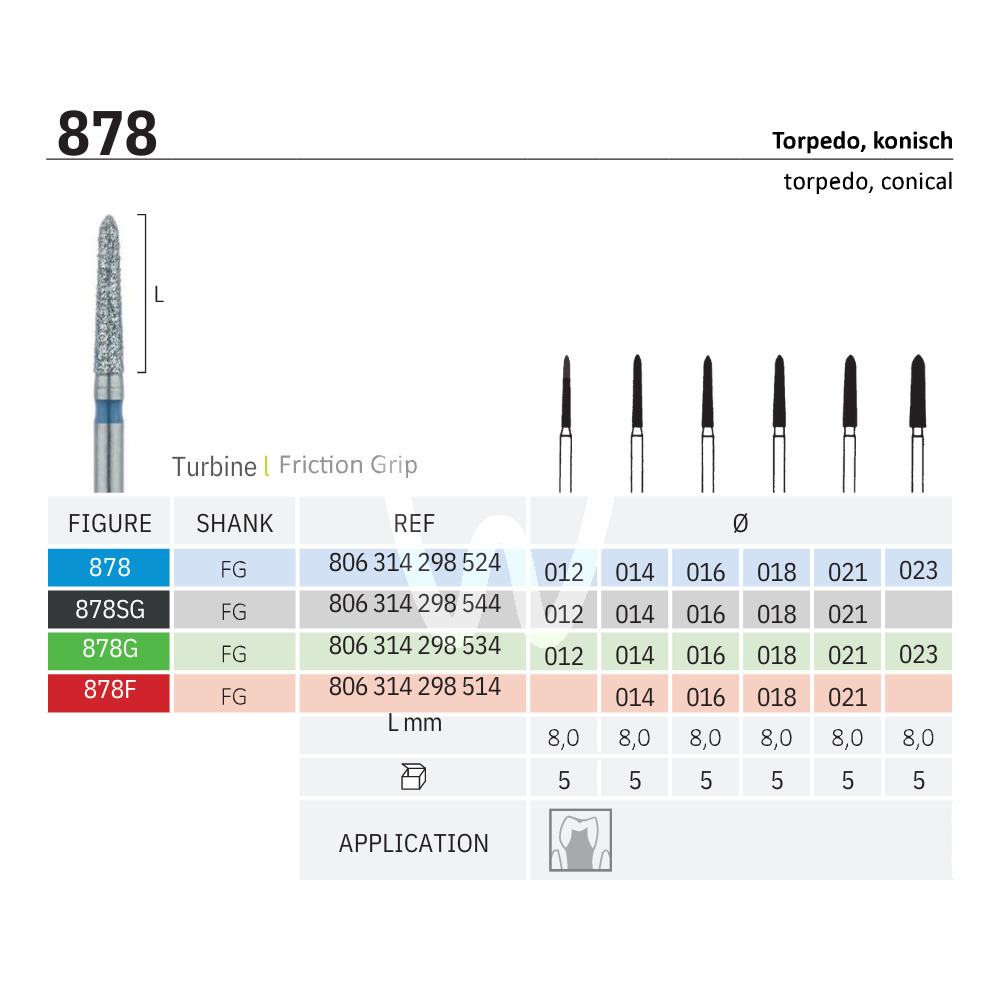 Wiertła diamentowe Jota w kształcie torpedy stożka: JOTA 878F.FG.018 z nasypem Fine i o średnicy 018, dostępne w blistrach zawierających 5 sztuk wskazanych narzędzi dentystycznych.