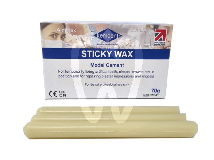Wosk lepki marki Kemdent w pałeczkach to praktyczny materiał pomocniczy do tymczasowego mocowania elementów protetycznych i napraw modeli, łatwy w użyciu i czysty w usuwaniu po podgrzaniu.